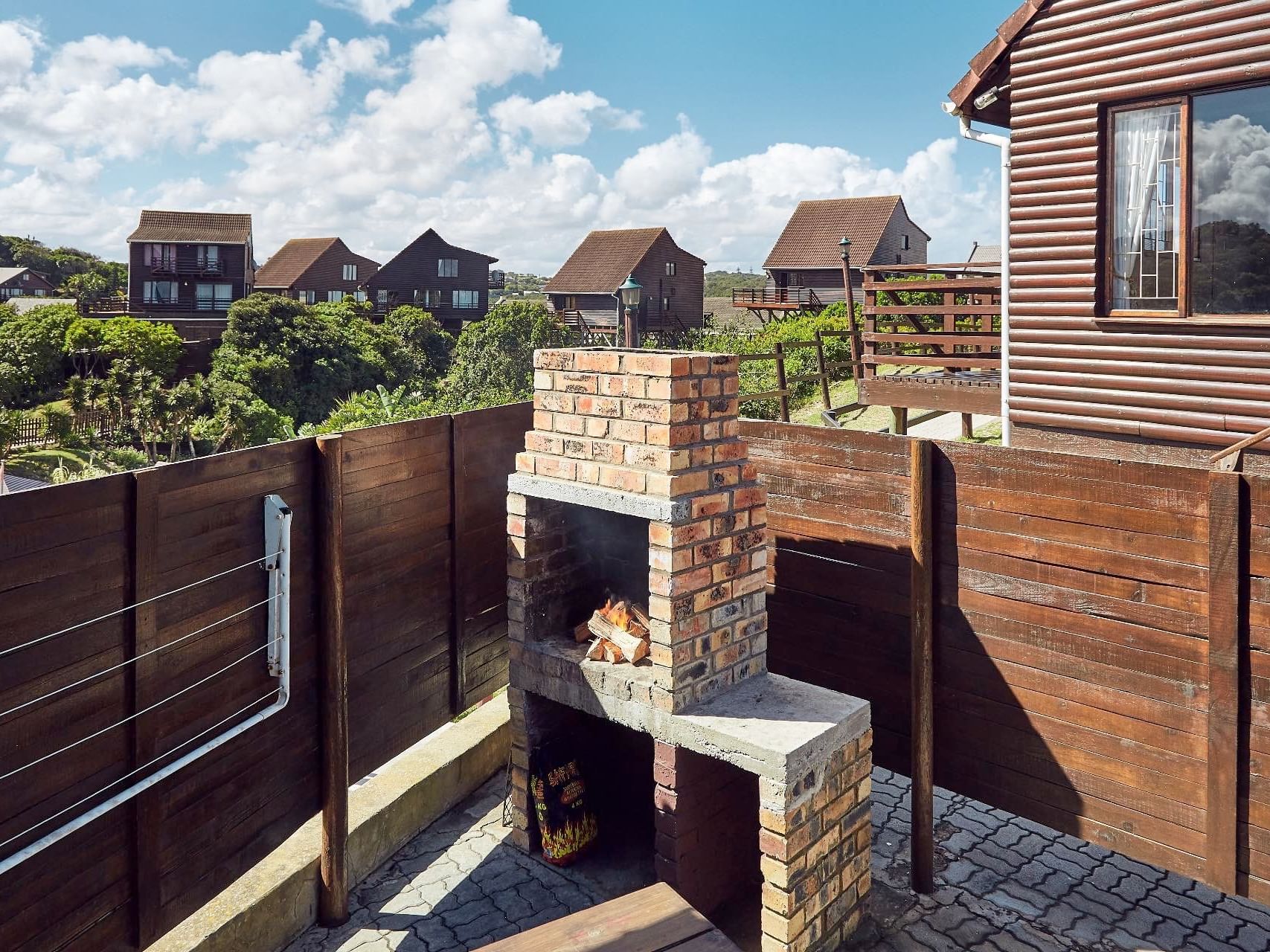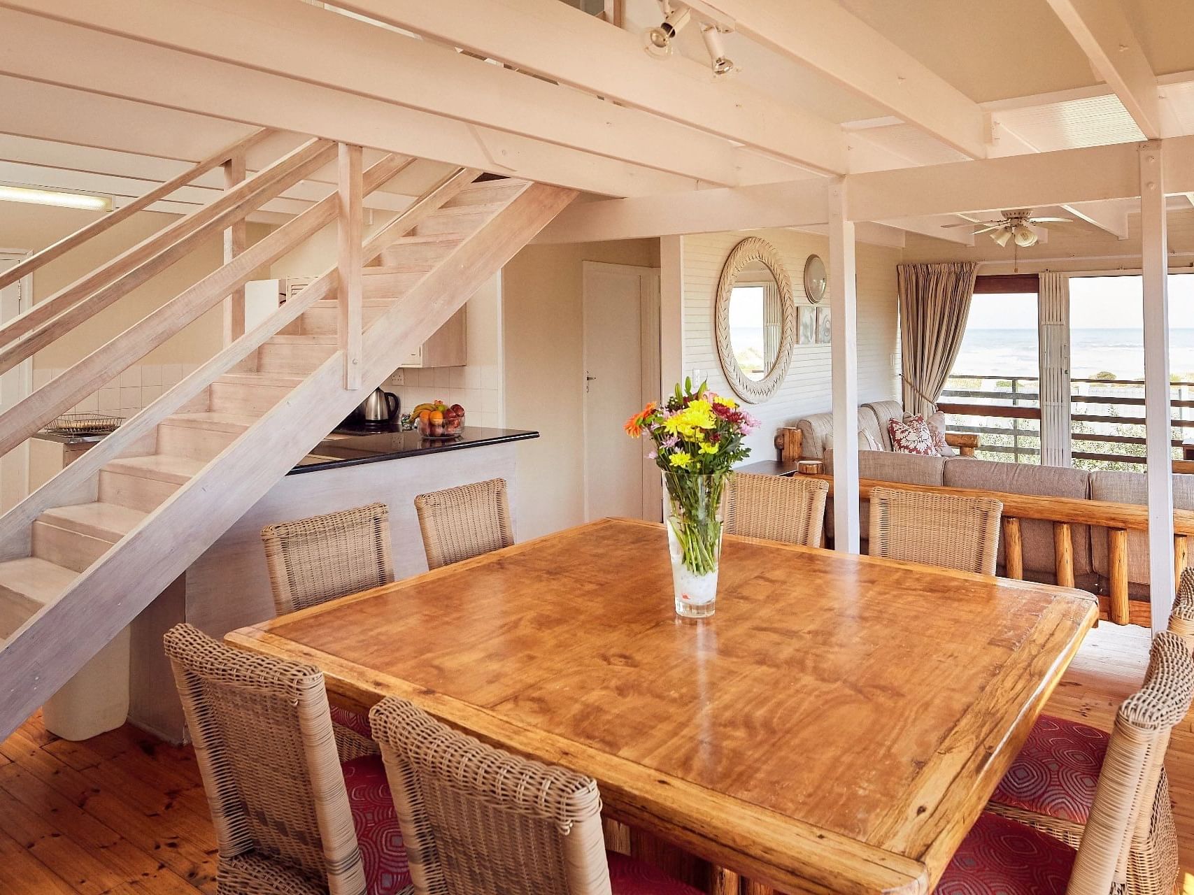 The open-plan living area includes a dining room and lounge which features a flat-screen television and flows onto a private patio or deck equipped with a charcoal braai.